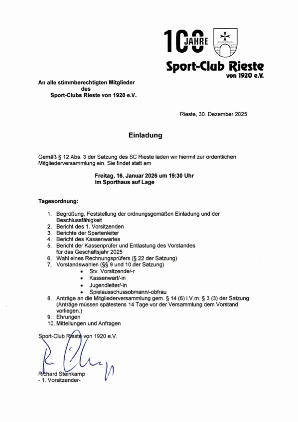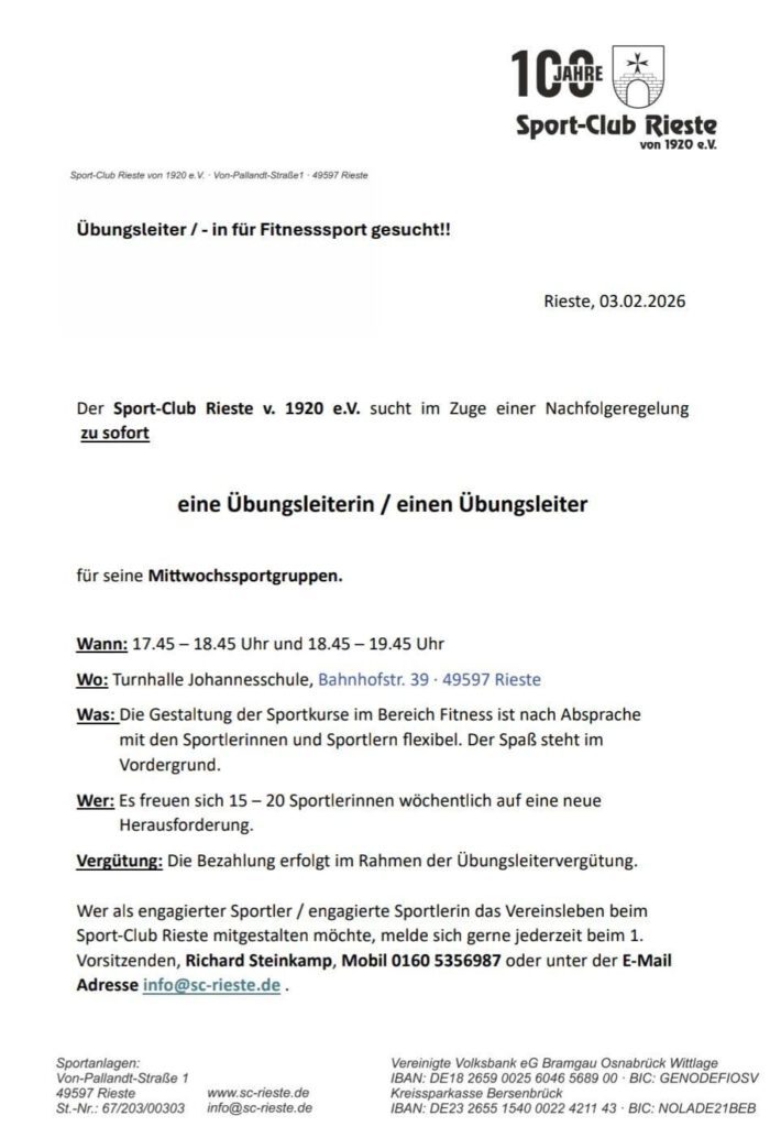 Als Fußballverein gestartet, hat sich der SC Rieste in den vergangenen 100 Jahren stets weiterentwickelt und bietet seinen Mitgliedern heute Angebote in den Bereichen: Fußball, Tischtennis, Boxen, Fitness, Yoga und Radsport.